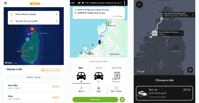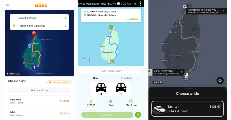 To find out, St. Lucia Times compared Uber’s estimated fares against two well-known local ride-hailing apps, Allez and Tropicab, using two common routes. The first was a short commute from Derek Walcott Square in Castries to the Baywalk Shopping Mall. The second was a longer trip from Vieux Fort Plaza to the Pigeon Island Causeway.