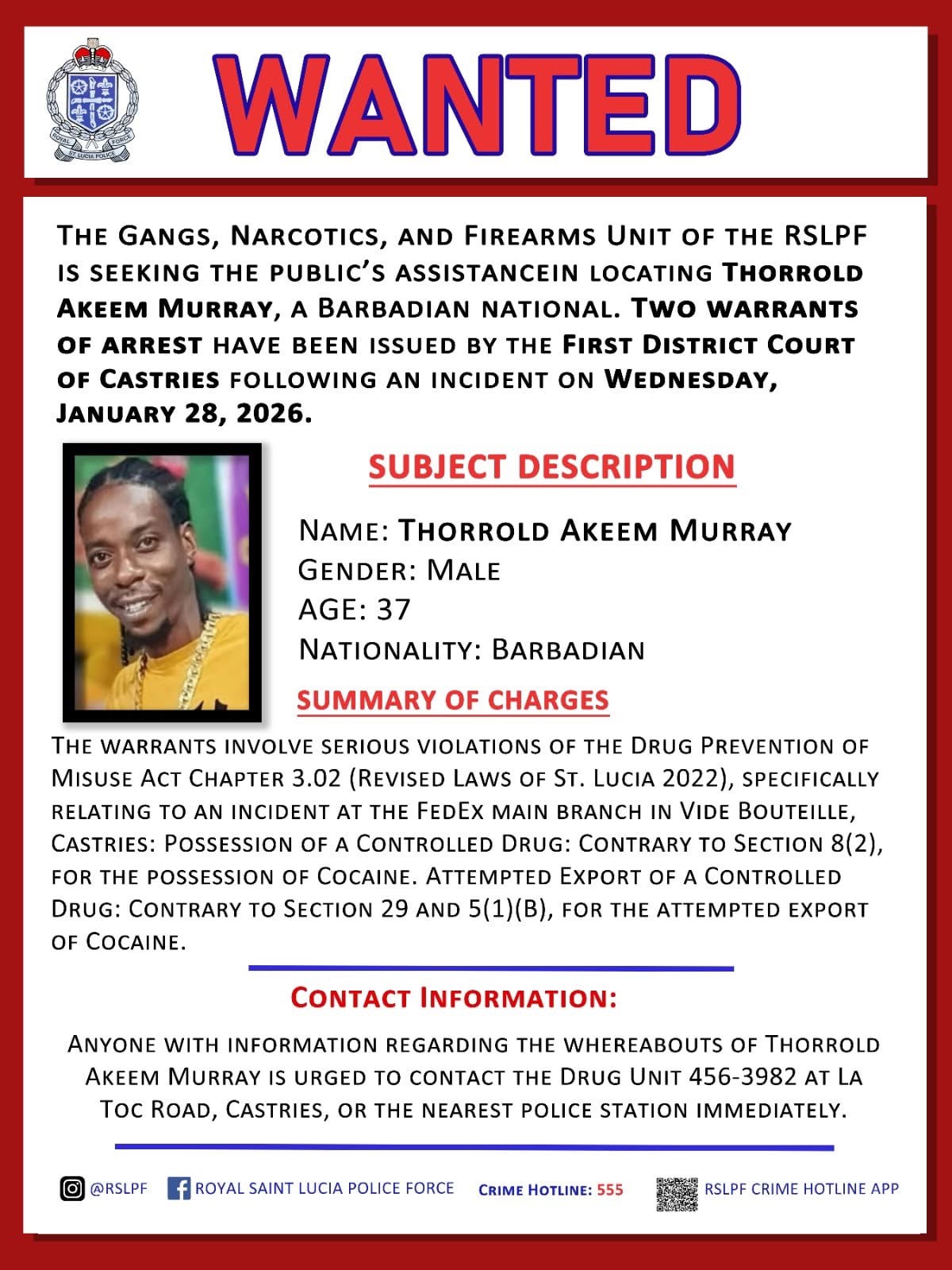 The Gangs, Narcotics and Firearms Unit of the Royal Saint Lucia Police Force has issued an appeal for information on the whereabouts of 37-year-old Thorrold Akeem Murray. The First District Court of Castries issued two warrants for his arrest following an incident on Wednesday, January 28, 2026.