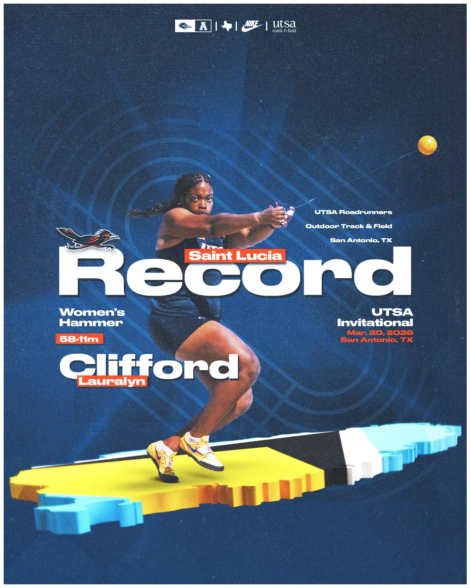 In the fifth round of competition, Clifford spun to a career-best 58.11m (190-8.00) toss for bronze. The mark is the No. 2 all-time performance in UTSA history and would have secured second in last year’s American Conference standings. The season-opening mark also topped Clifford’s Saint Lucia national record of 56.55m from 2024.